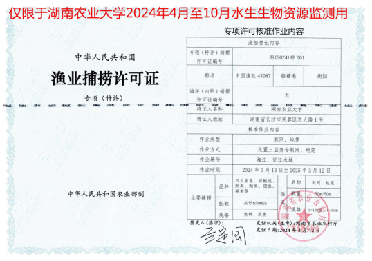 附件1:中华人民共和国渔业捕捞许可证(专项特许)湘(2024)特001-湖南农业大学