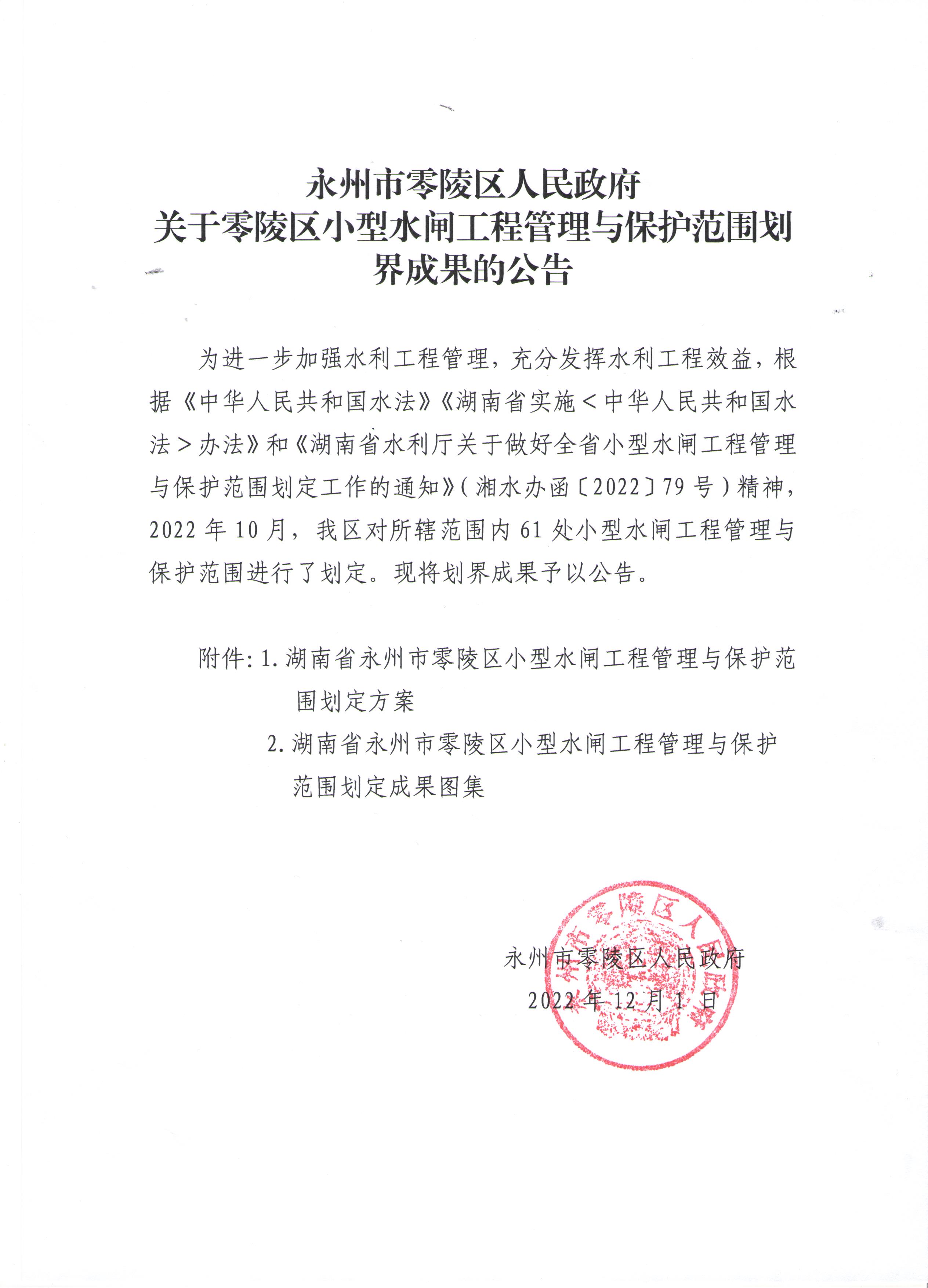 关于零陵区小型水闸工程管理与保护范围划界成果的公告