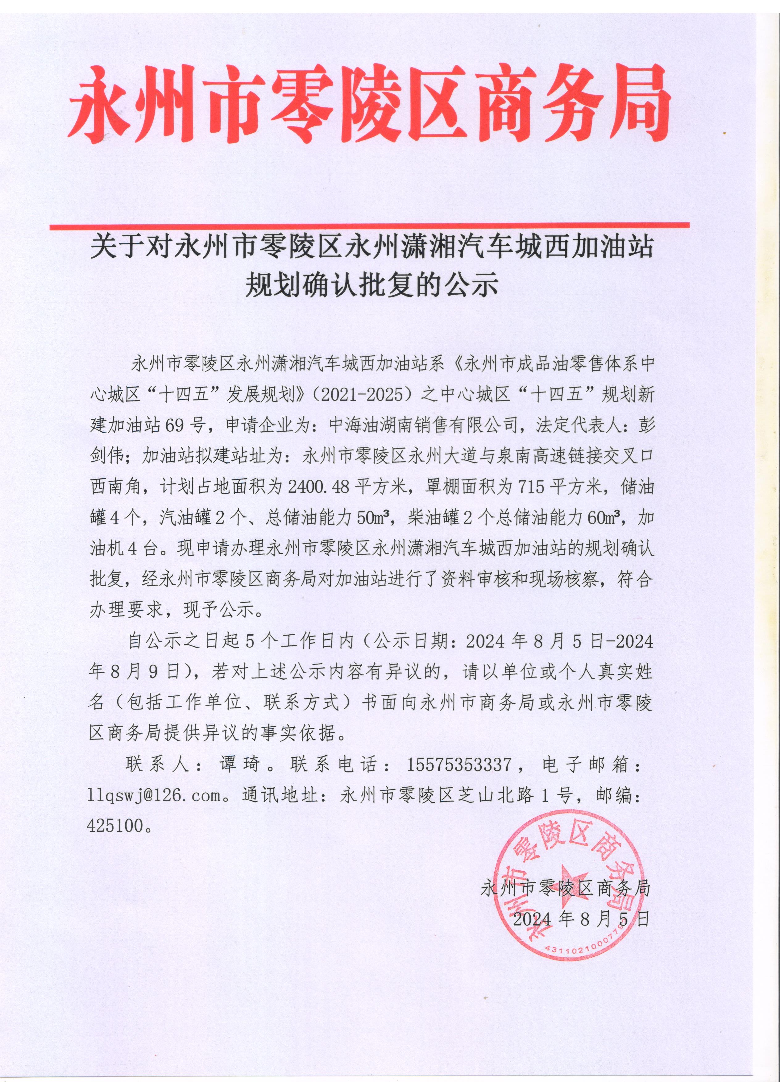 关于对永州市零陵区永州潇湘汽车城西加油站规划确认批复的公示