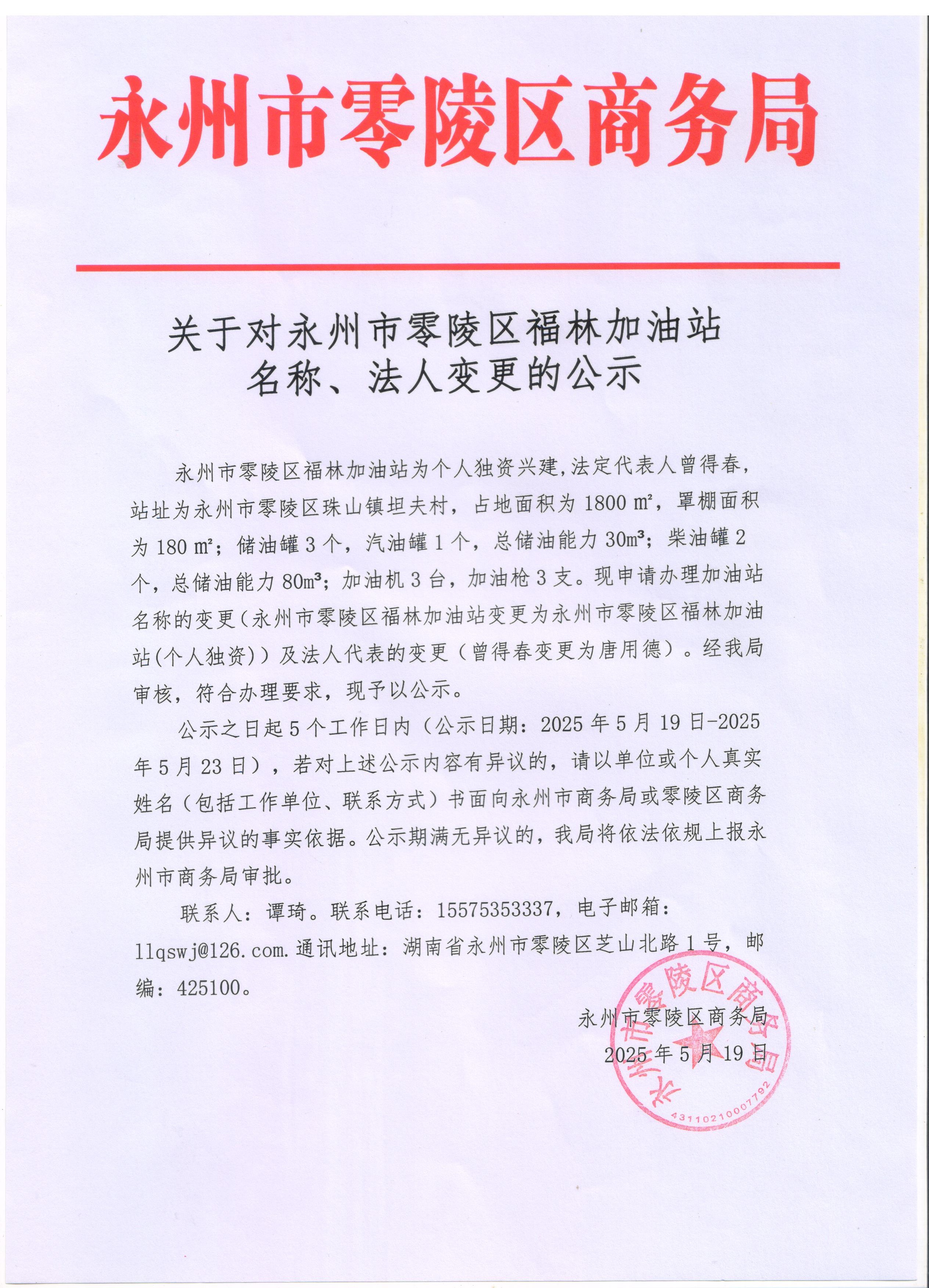 关于对永州市零陵区福林加油站名称、法人变更的公示