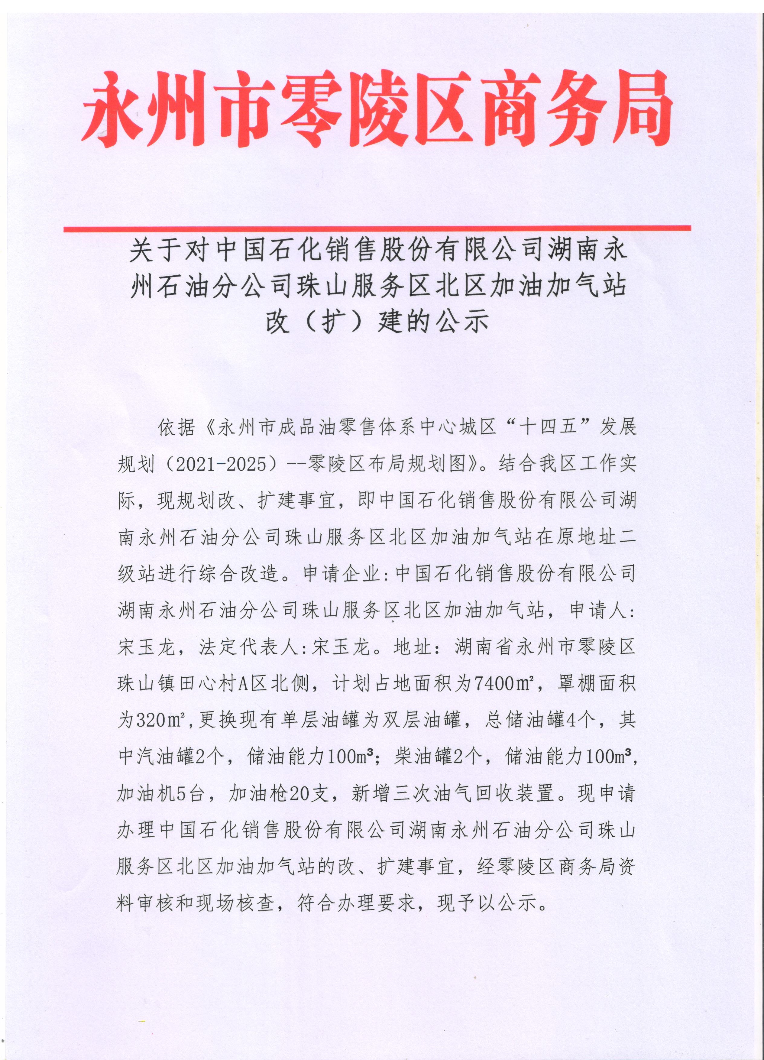 关于对中国石化销售股份有限公司湖南永州石油分公司珠山服务区北区加油加气站改(扩)建的公示