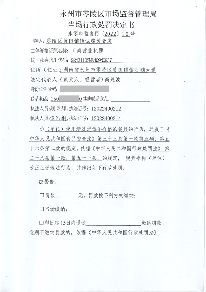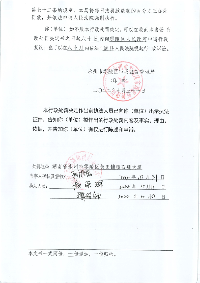 永州市零陵区市场监督管理局当场行政处罚决定书(永零市监当罚〔2022〕10号)