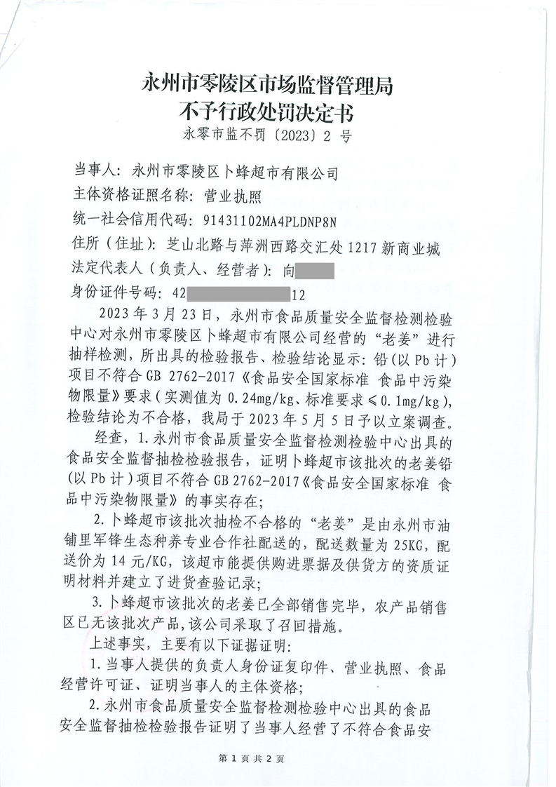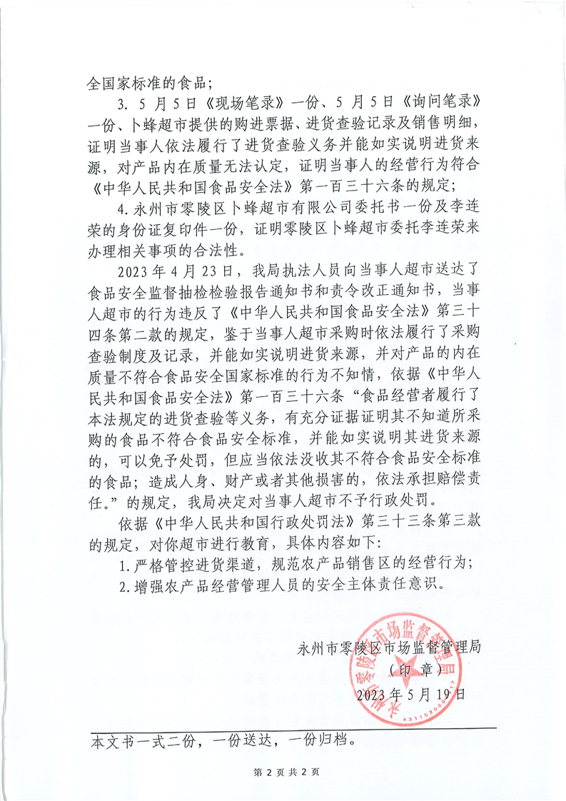 永州市零陵区市场监督管理局不予行政处罚决定书(永零市监不罚〔2023〕2号)