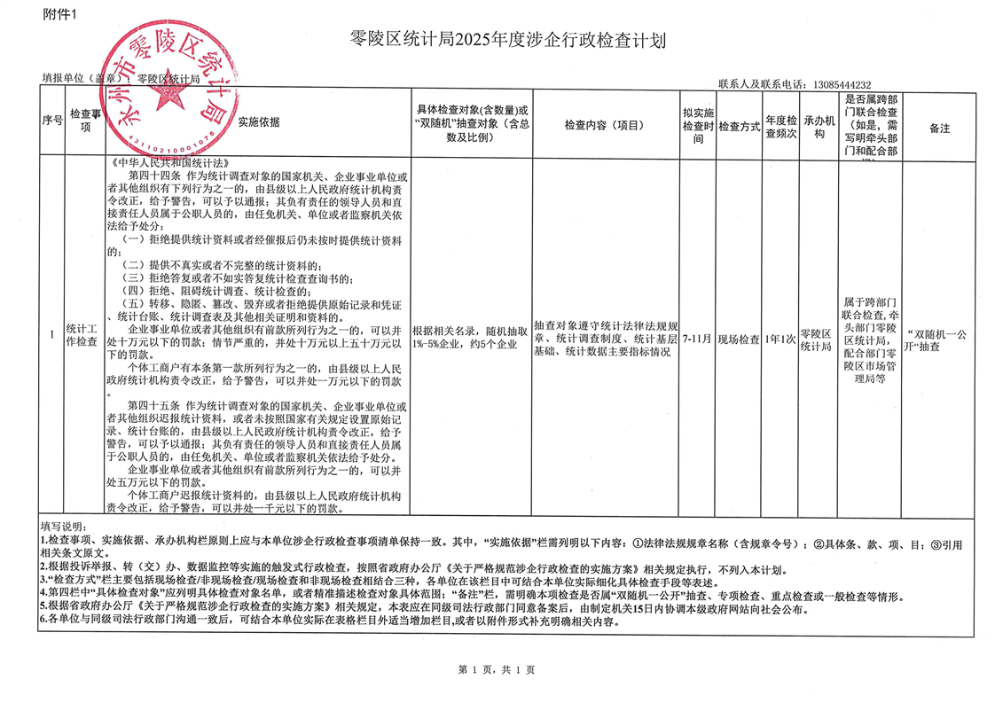 零陵区统计局2025年度涉企行政检查计划