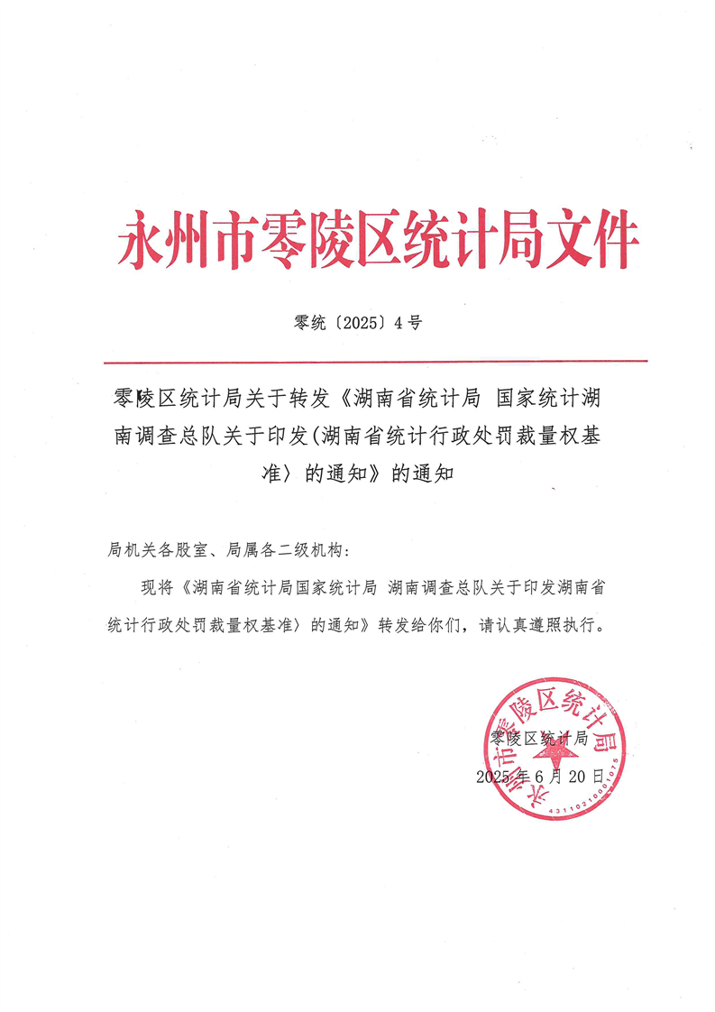 零陵区统计局关于转发《湖南省统计局 国家统计湖南调查总队关于印发(湖南省统计行政处罚裁量权基准)的通知》的通知