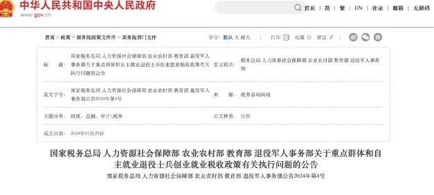 国家税务总局 人力资源社会保障部 农业农村部 教育部 退役军人事务部 2024年3月29日