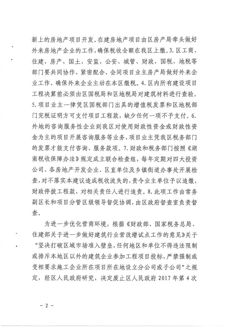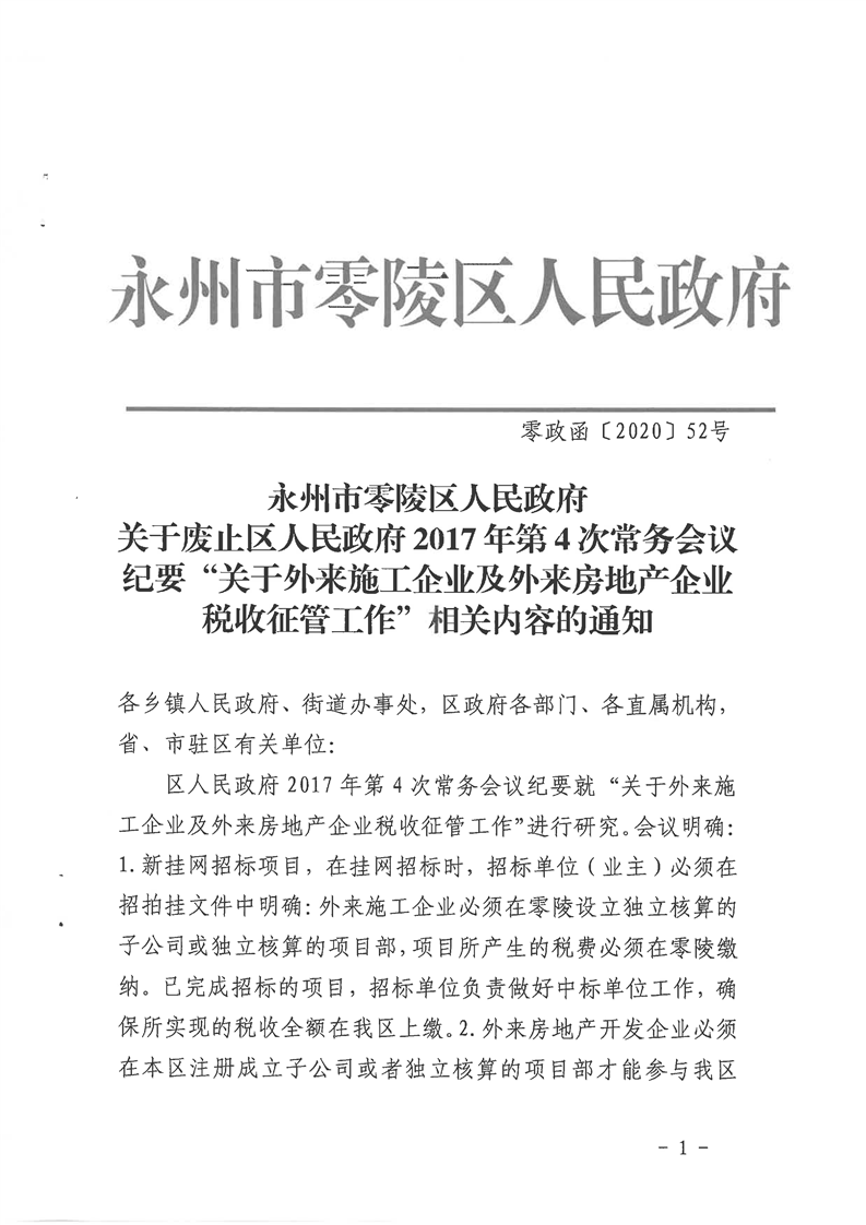 关于废止区人民政府2017年第4次常务会议纪要“关于外来施工企业及外来房地产企业税收征管工作”相关内容的通知