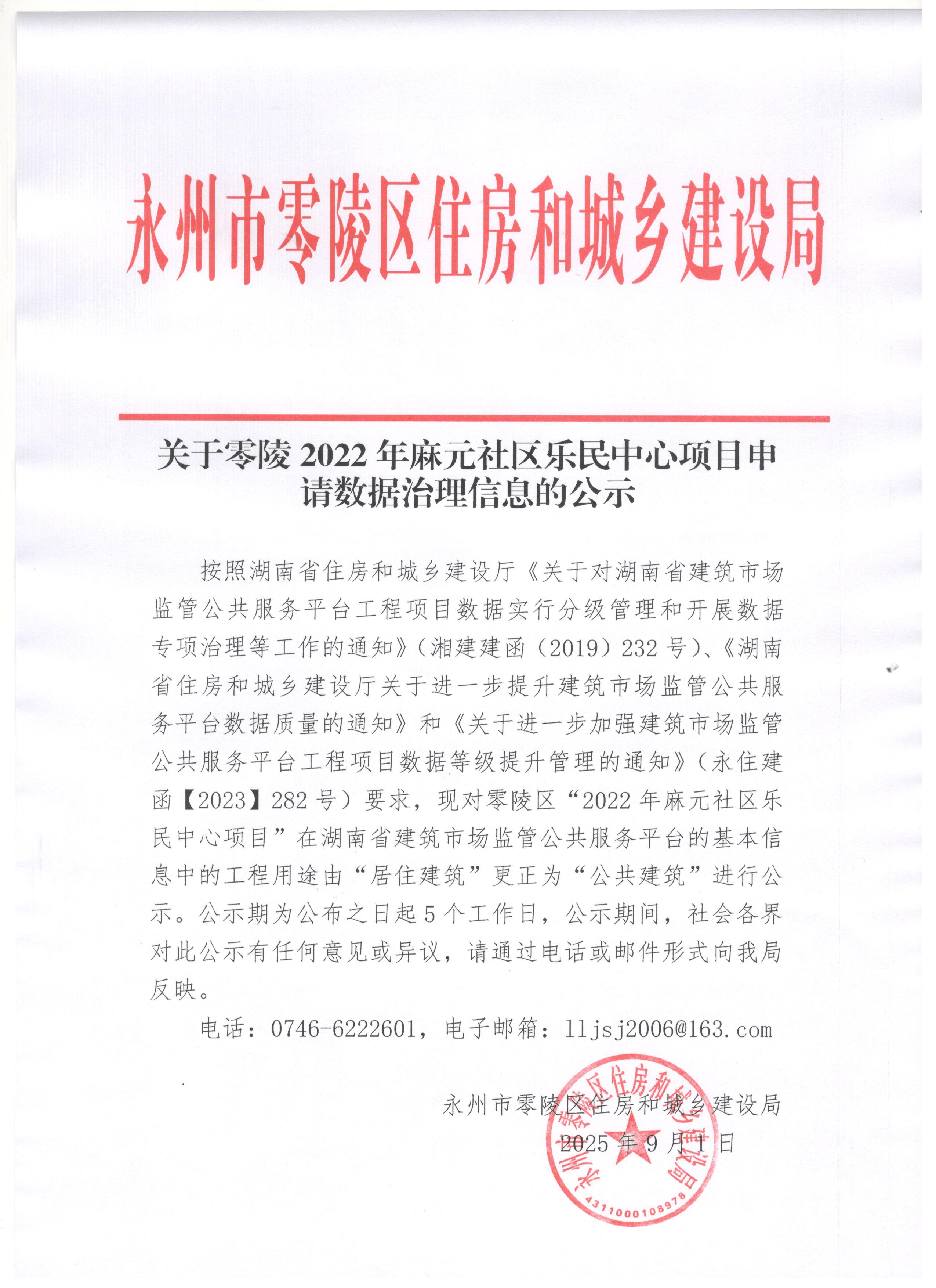关于零陵2022年麻元社区乐民中心项目申请数据治理信息的公示