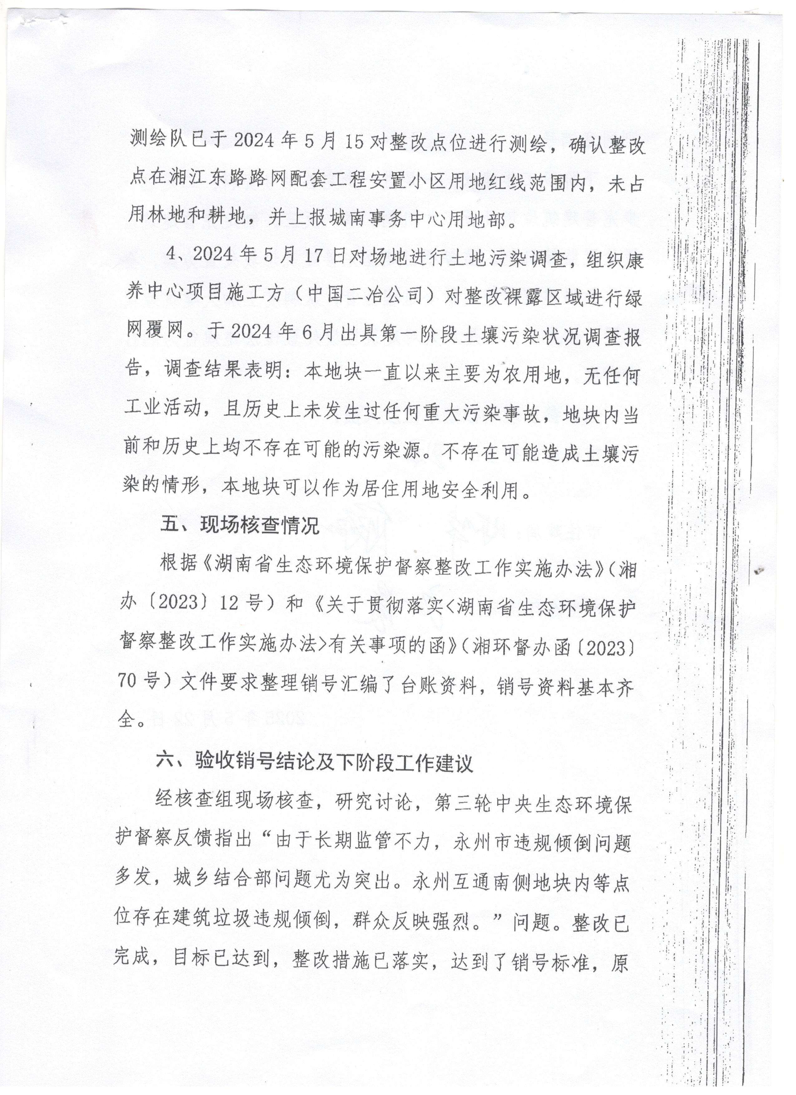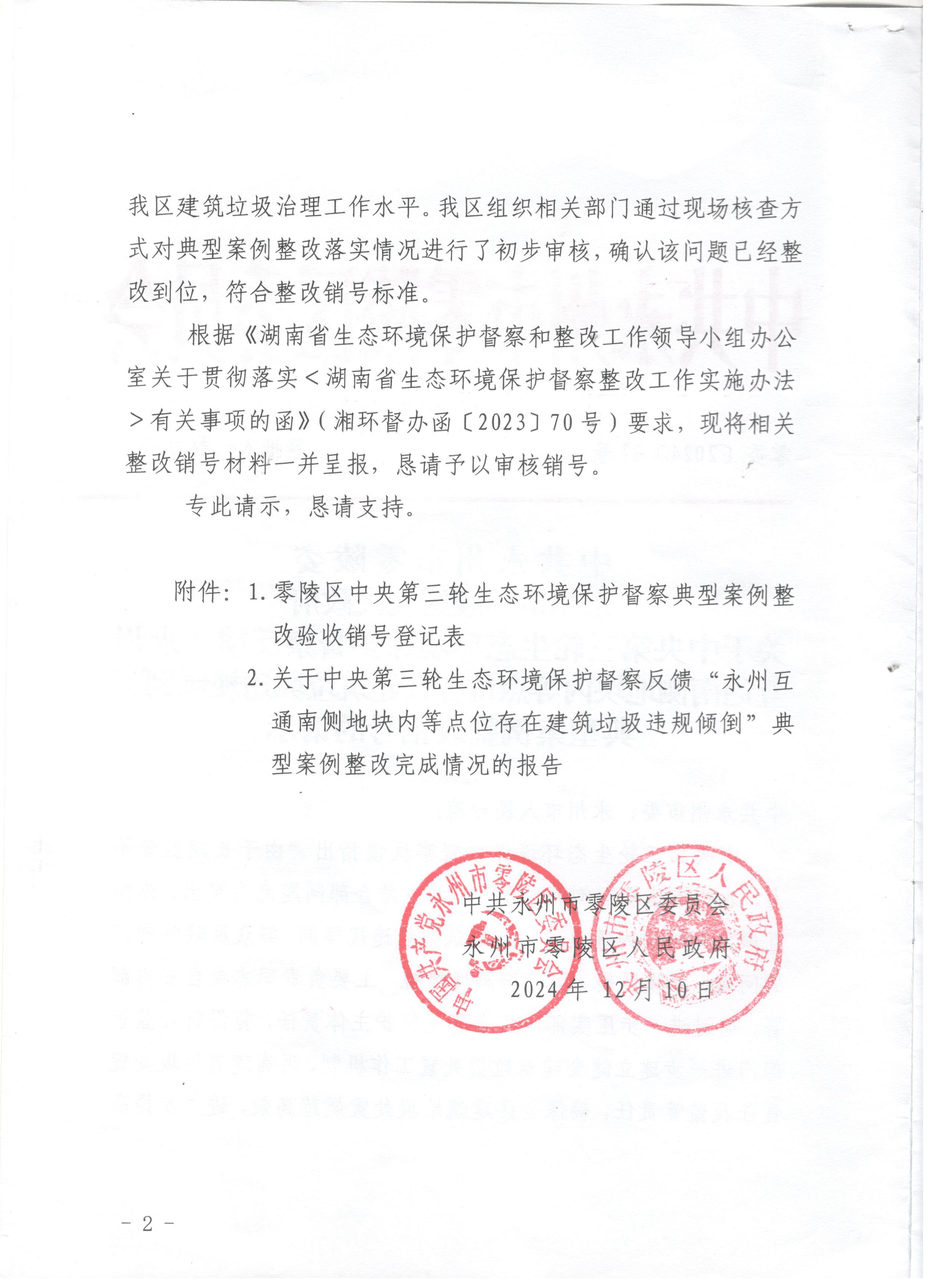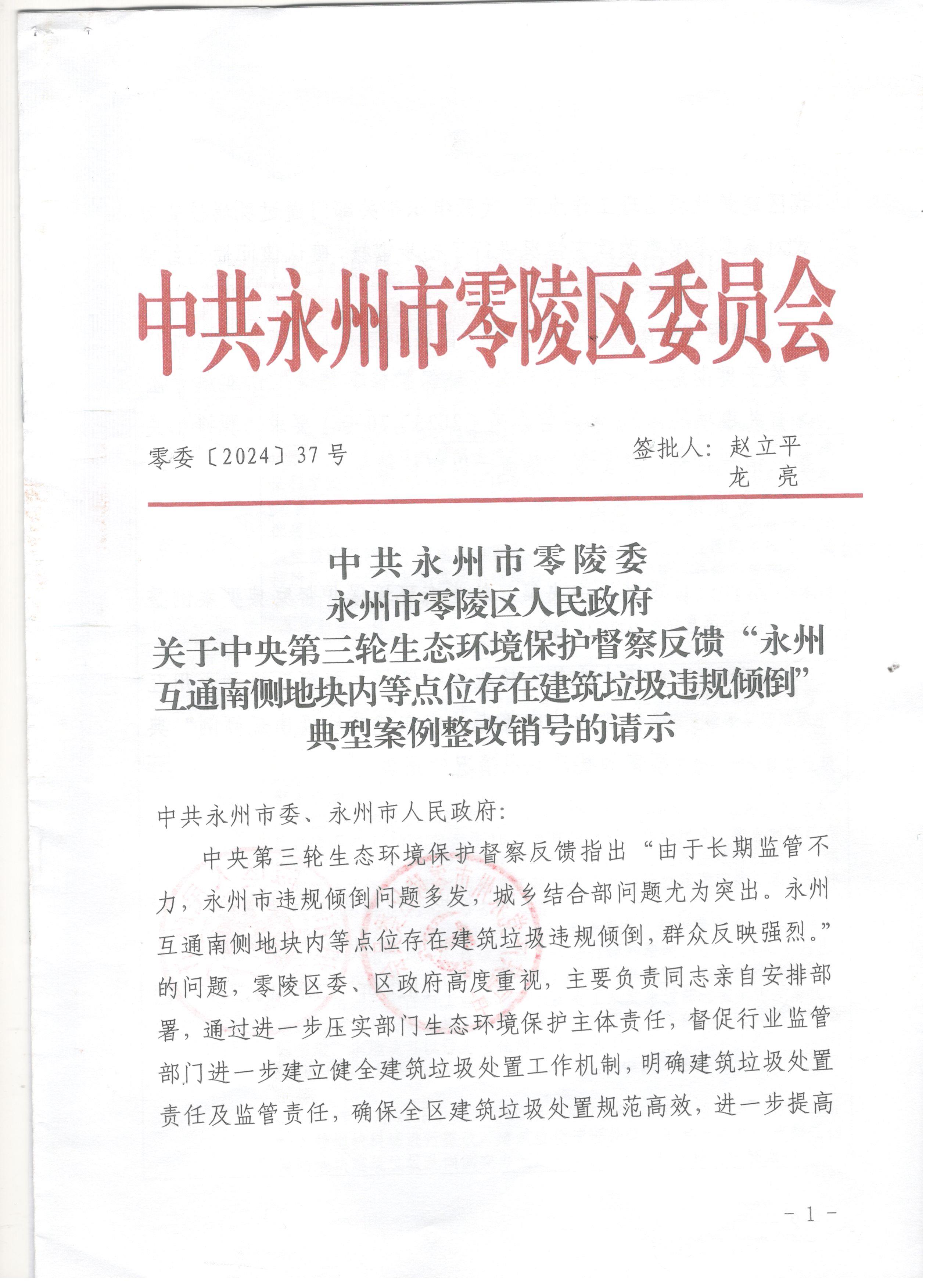 关于中央第三轮生态环境保护督察反馈“永州互通南侧地块内等单位存在建筑垃圾违规倾倒”典型案例整改销号的请示
