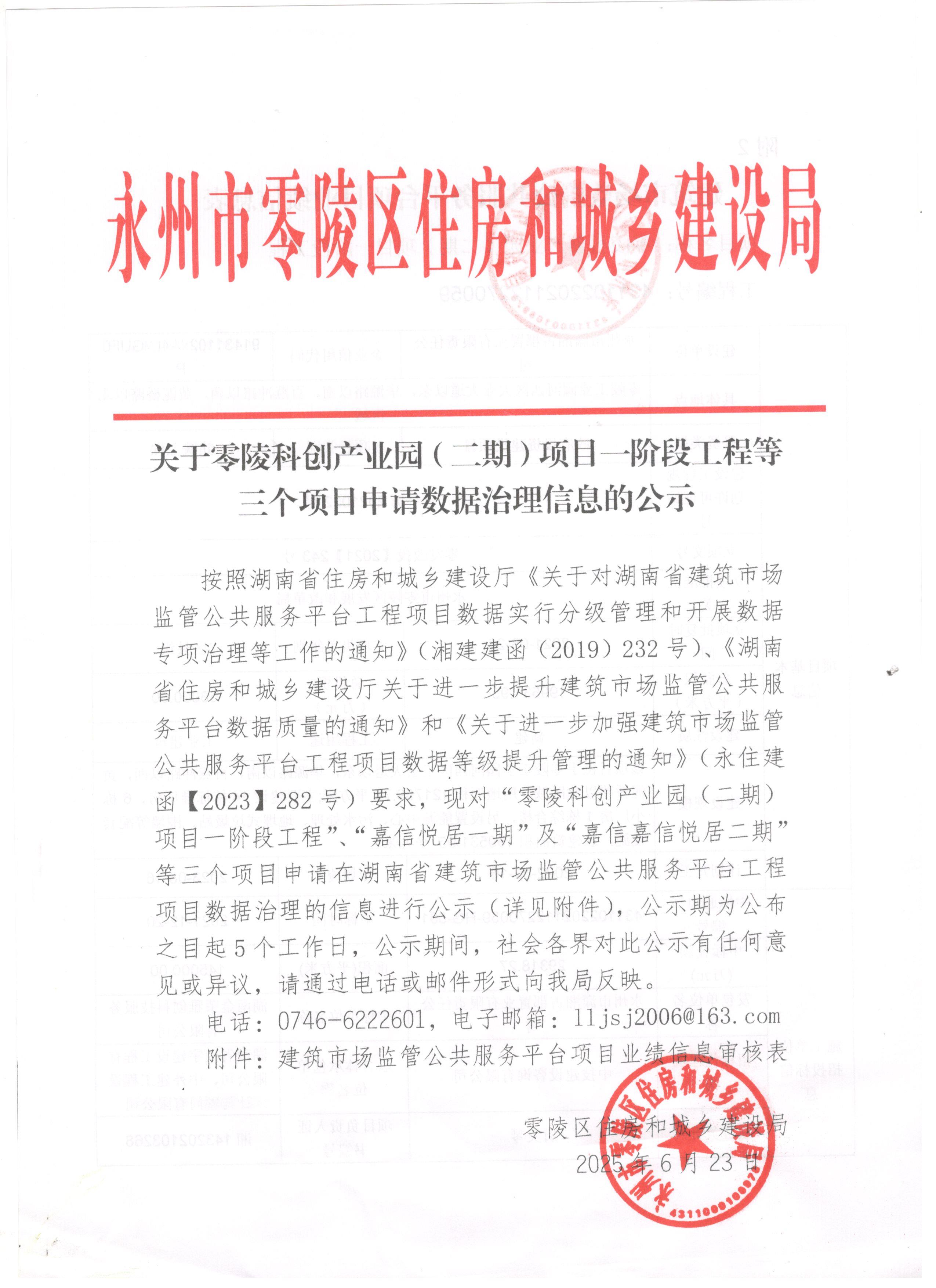 关于零陵科创产业园(二期)项目一阶段工程等三个项目申请数据治理信息的公示