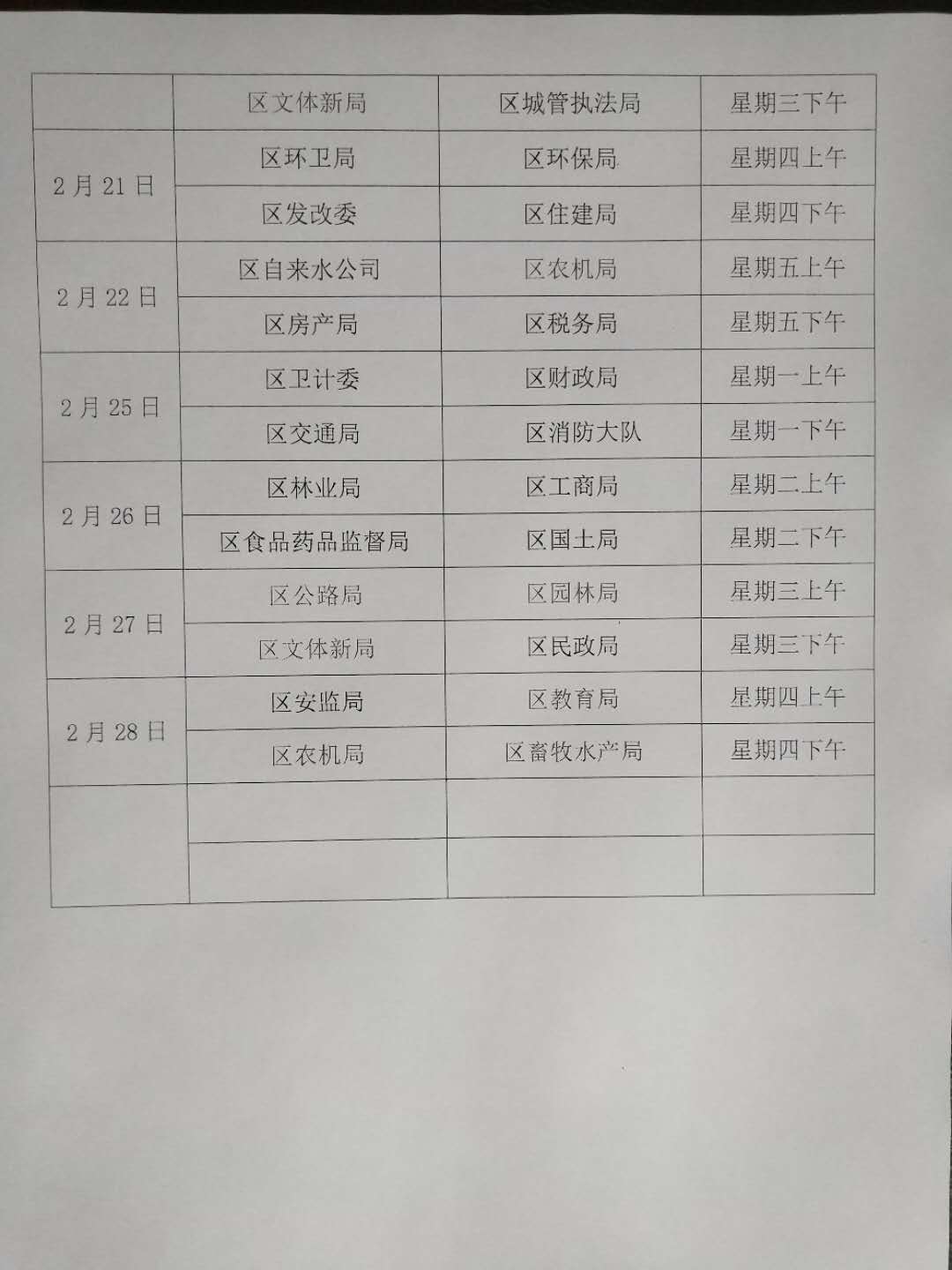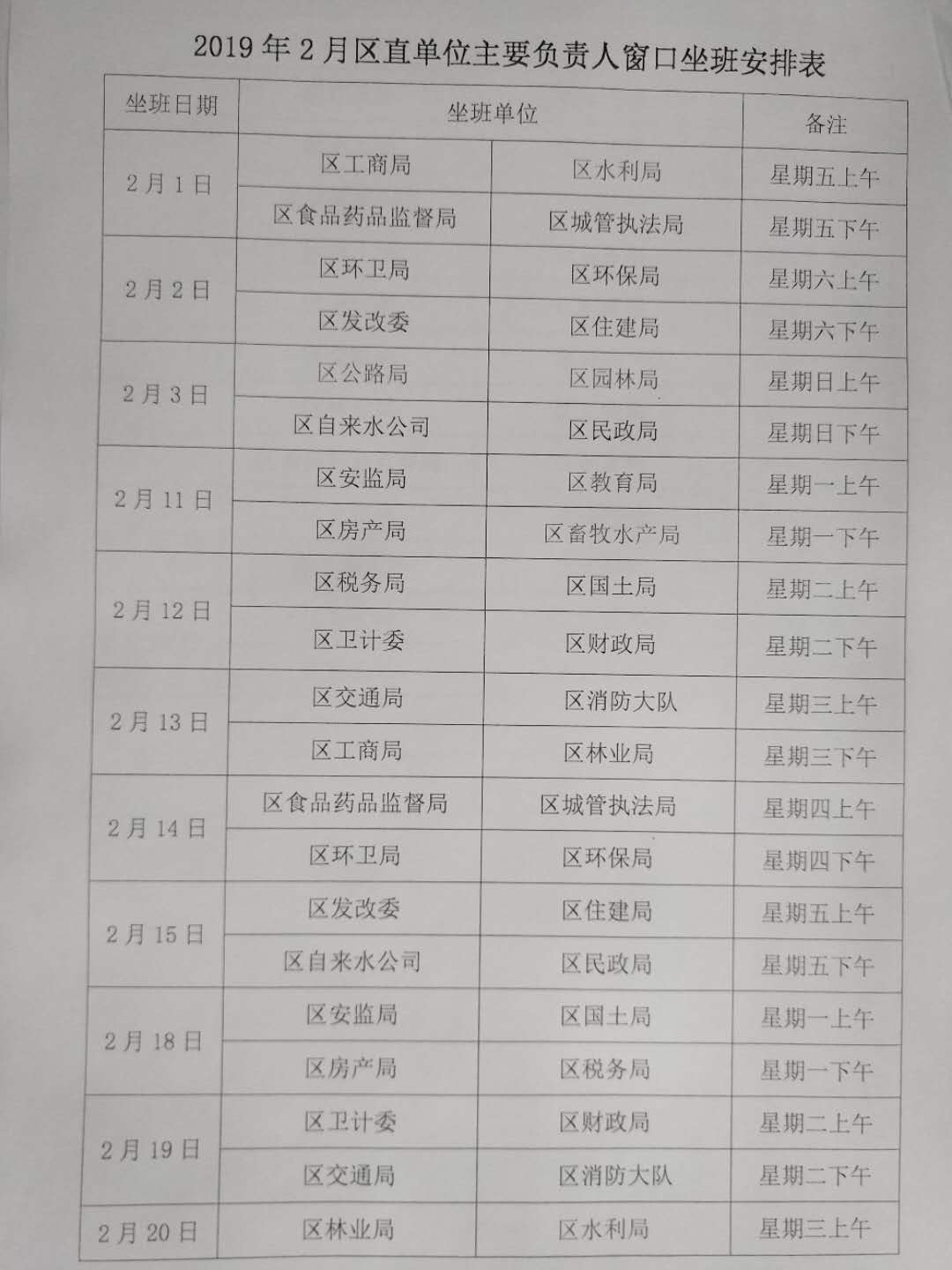 2019年2月区直单位主要负责人窗口坐班安排表
