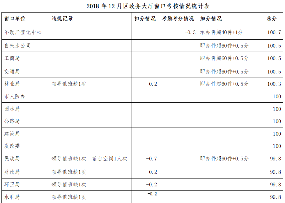 2018年12月,区交通局、区自来水公司窗口、区不动产登记中心窗口获 “红旗窗口”荣誉称号,区工商分局窗口周丹、区不动产登记中心窗口唐敏欣、区自来水公司于娟娟、区交通局窗口李虎获“优质服务之星”荣誉称号。