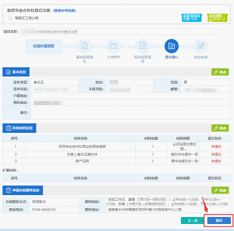 9、进入下一步“提交确认”环节,确认基本信息、提交材料、取件信息无误后,点击提交按钮完成在线申报,如发现任一环节有问题需修改,可点击右边“修改”按钮进行信息修改