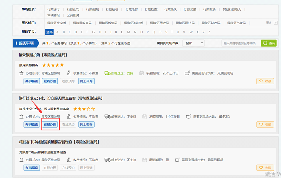 4、选择对应办理的服务事项,点击“在线办理”进入下一步,也可先点击“办事指南”进行事项相关材料、流程等信息的查看