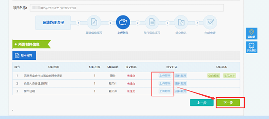 6、进入“上传附件”环节,点击“上传附件”按钮或“材料复用”按钮,对事项所需材料进行上传,上传完成后点击下一步;