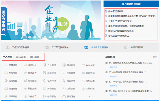 3、可根据申报事项的不同类型在“网上申报热点事项”、“个人办事”、“法人办事”、“部门服务”进行查找
