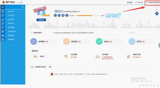 2、可在用户中心查看办件情况及咨询投诉等信息,点击右上角“返回政务服务首页”可进行事项申报