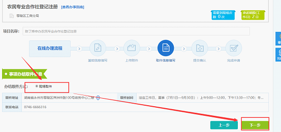 8、上传所有对应材料进入“取件信息”填写环节,选择“取件方式”,确认“取件地址”和“电话”后点击下一步;