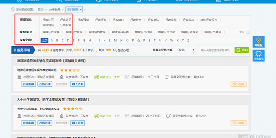 4、选择具体的“事项性质”、“服务部门”进行详细搜索,最后在下方选择需要办理的“服务事项”