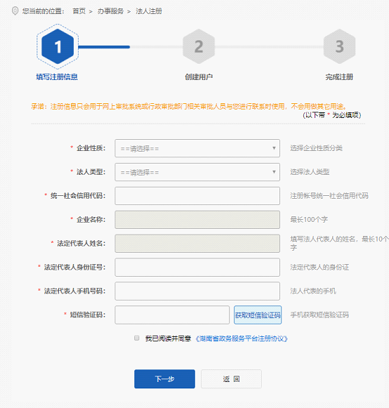注:其中统一社会信用代码、法定代表人身份证号码、手机号码只能使用一次,且必须有效;