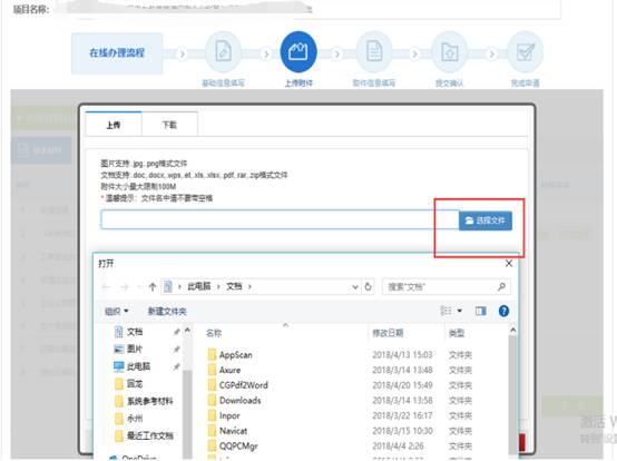 7、点击“文件上传”按钮,在弹出框内点击“选择文件”按钮,选择对应材料进行上传;