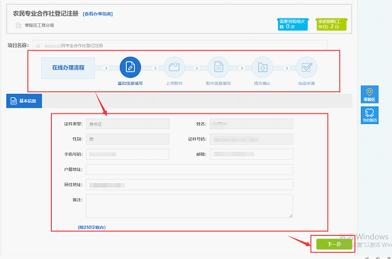 5、按照在线办理流程,完成基本信息填写,填写完后点击下一步;