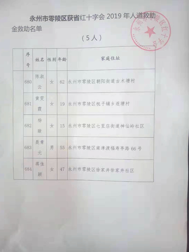永州市零陵区获省红十字会2019年人道救助金救助名单