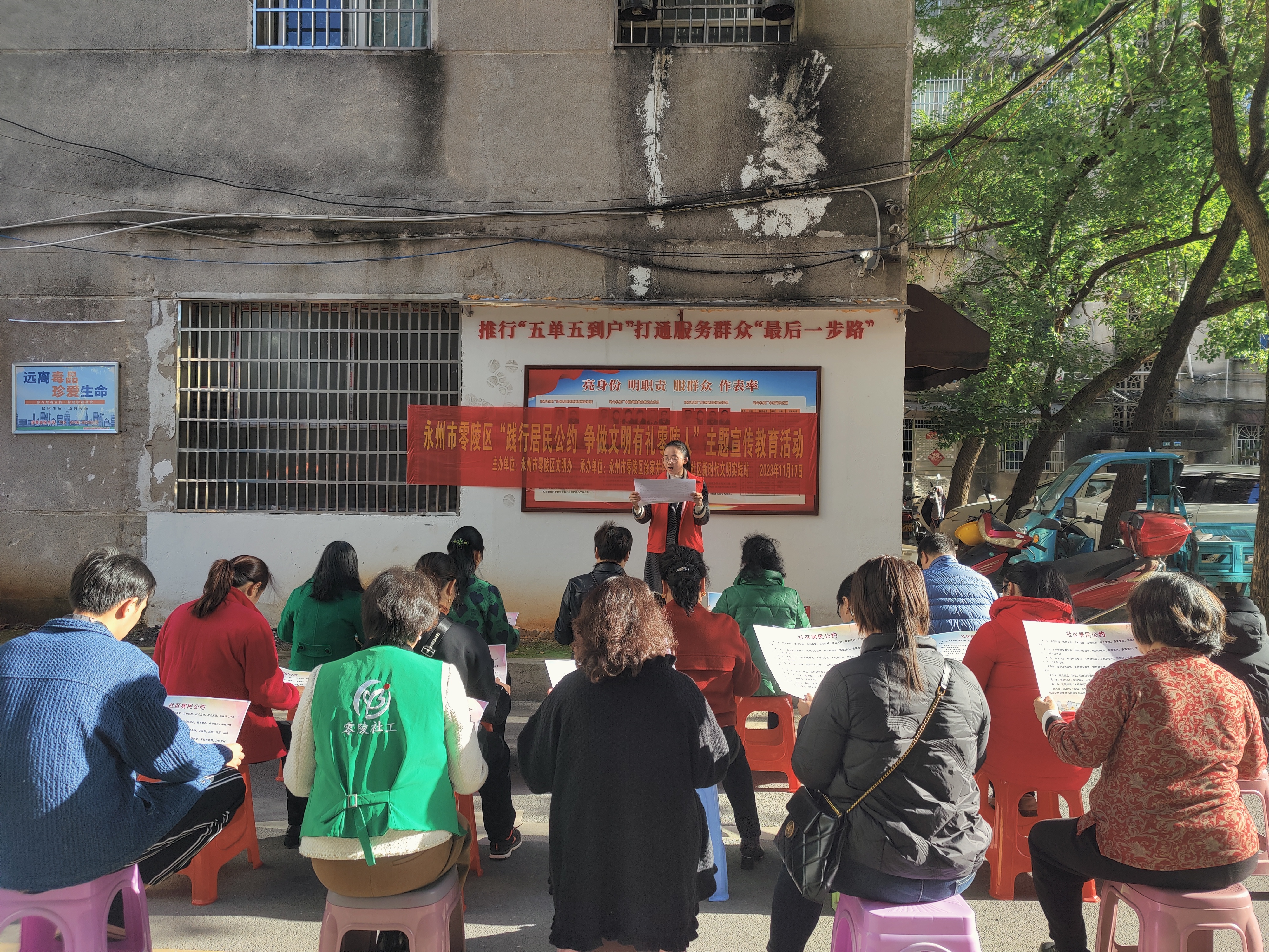 近日,徐家井街道社工站联合徐家井街道新时代文明实践所,伍玲妇女微家、动力机械厂小区开展“践行居民公约,争做文明有礼零陵人”宣传活动,进一步深化精神文明建设。