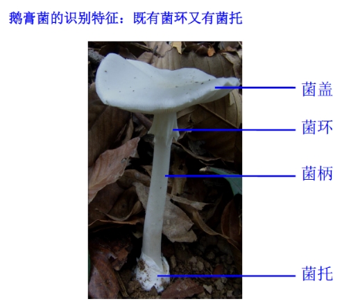 剧毒鹅膏菌是毒蘑菇中比较好识别和区分的,它同时具有菌盖、菌柄、菌环和菌托。通俗地说,就是“头上戴帽(指有菌盖)、腰间系裙(指有菌环)、脚上还穿鞋(指有菌托)”的蘑菇就是鹅膏菌。这类蘑菇大部分是有毒的,因此,凡是“头上戴帽、腰间系裙、脚上还穿鞋”的蘑菇千万不能采食。