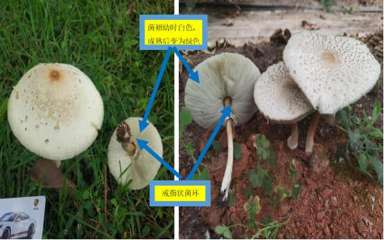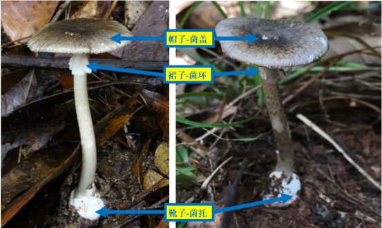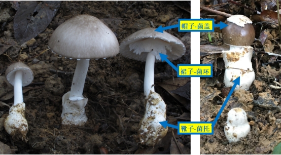 识别要点:与剧毒的肝损害型鹅膏类似,头上带帽(菌盖),腰间系裙(菌环),脚上穿靴(菌托)。