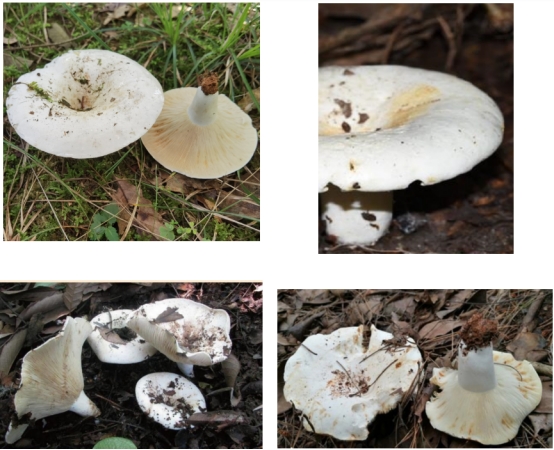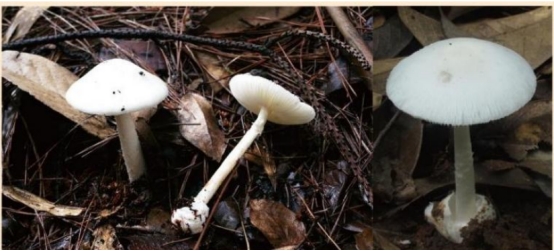 识别要点:纯白色,与剧毒的肝损害型鹅膏类似,头上带帽(菌盖),腰间系裙(菌环),脚上穿靴(菌托)。