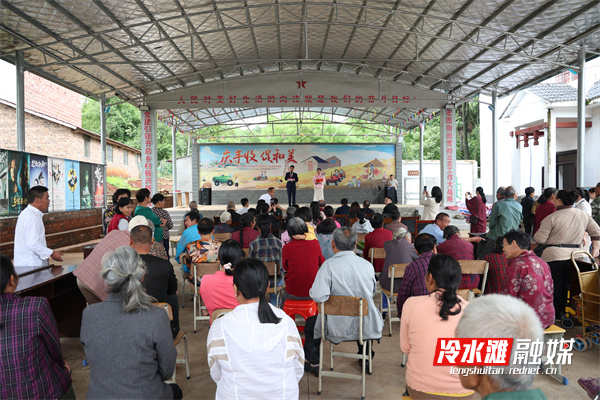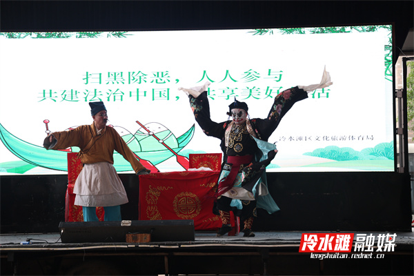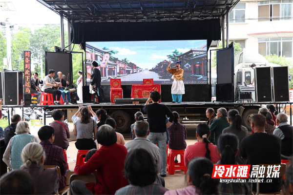 在这片舞台,有村民们自己表演的歌舞节目,有电子智能“小舞狮”吸引了众多村民互动,还有冷水滩区新时代文明实践中心、区文旅体局与区文化艺术团、区文化馆联合开展的“文化进基层”活动,为村民们带来了精彩纷呈的祁剧表演。舞台旁边还设置了非遗宣传展板,详细展示了扎故事、剪纸、土陶等各项非遗项目,大家聚在一起载歌载舞,共享丰盛文化大餐,现场气氛热烈。