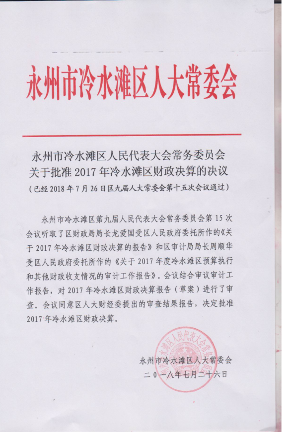 区第九届人大第二次会议审查批准了《关于冷水滩区2017年财政预算执行情况和2018年财政预算草案的报告》,目前,财政决算已经汇编完成。根据《中华人民共和国预算法》等法律规定和区人大常委会的工作安排,我受区人民政府委托,向本次常委会提出2017年财政决算报告,请予审议。同时,简要汇报2018年上半年财政预算执行情况。