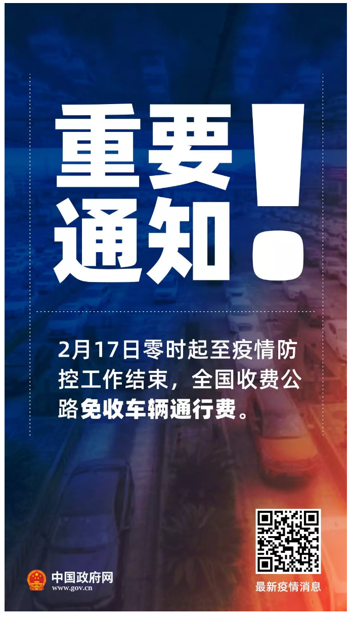 2月15日,从交通运输部获悉,经国务院同意,2月17日零时起至疫情防控工作结束,全国收费公路免收车辆通行费。具体截止时间另行通知。