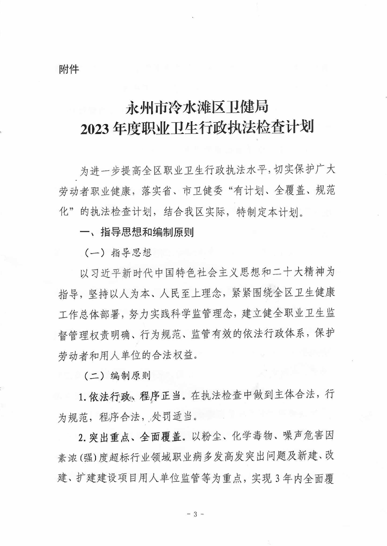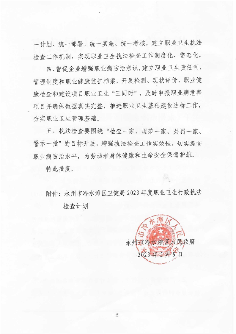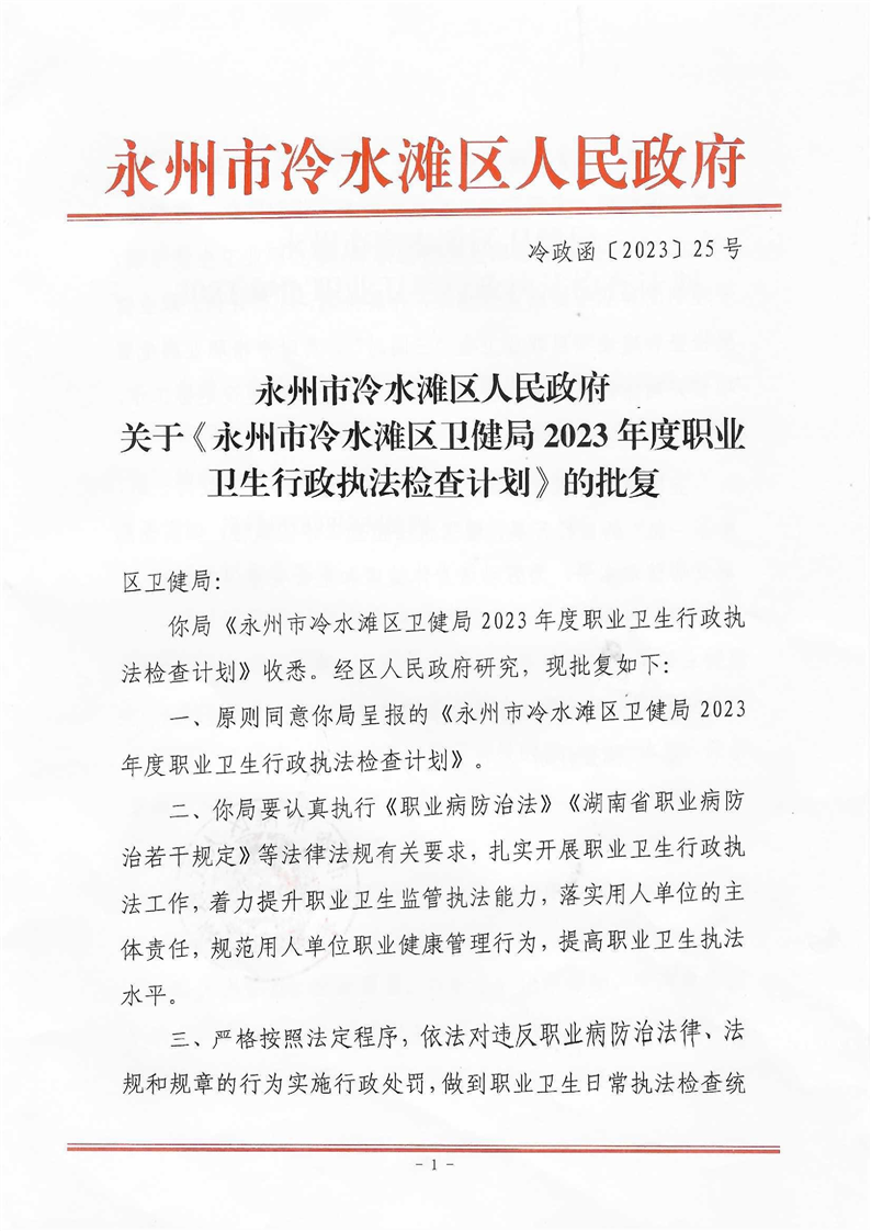 永州市冷水滩区人民政府关于《永州市冷水滩区卫健局2023年度职业卫生行政执法检查计划》的批复