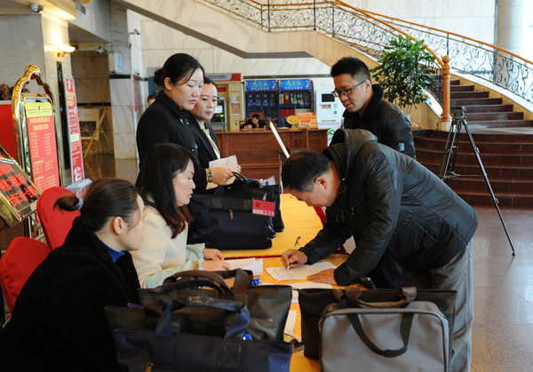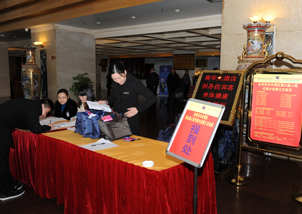 12月26日上午,参加冷水滩区九届人大三次会议的代表们陆续赶到驻地报到,他们肩负重托、满怀激情。本次会议会期四天,于26日-29日举行。在会务工作人员引导下,代表们有序地领取代表证和相关材料,仔细将证件佩戴在胸前,认真听取注意事项,现场秩序井然、气氛热烈。