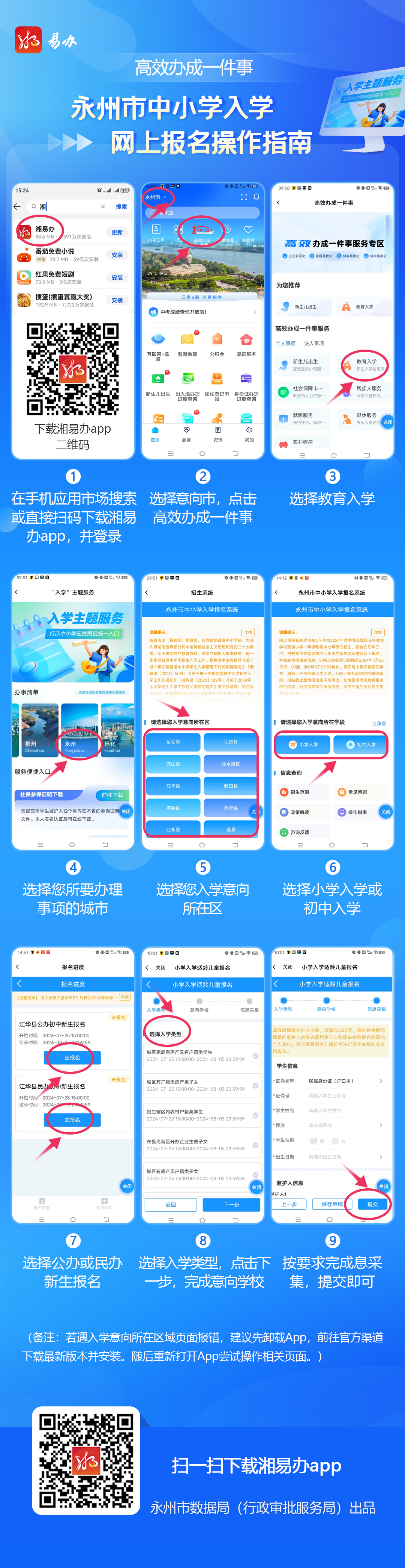 本网讯(通讯员 周旺 李家瑶) 近日,永州市中小学报名正在进行。为方便群众办事,“湘易办”APP中的“高效办成一件事”专区推出了入学“一件事”功能,将传统的“证明核验现场”搬到“网上”,为申请人开通“便利之门”,在家就能完成报名,实现云上核验“不见面”、申请对象“零跑腿”。