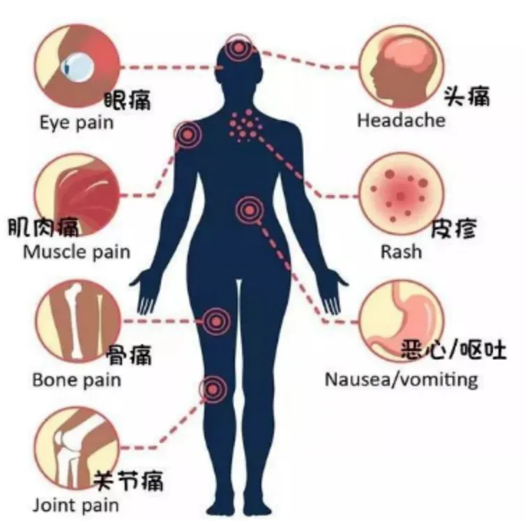 人感染病毒后,大多在5-9天发病。由于患者在发病时会有剧烈的肌肉关节疼痛,又被称为“断骨热”。