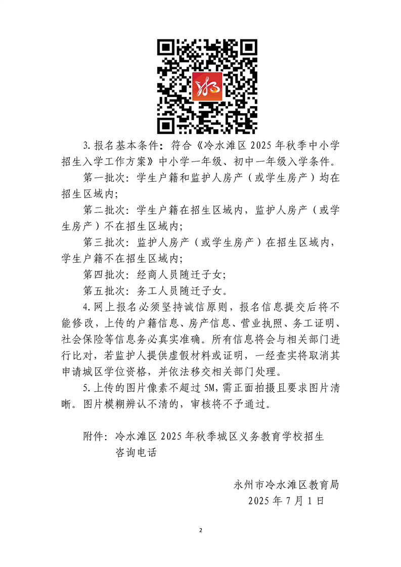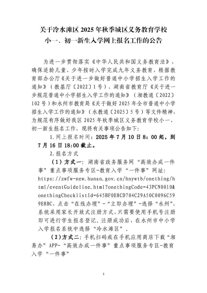 冷水滩区关于2025年秋季城区义务教育学校小一、初一新生入学网上报名工作的公告