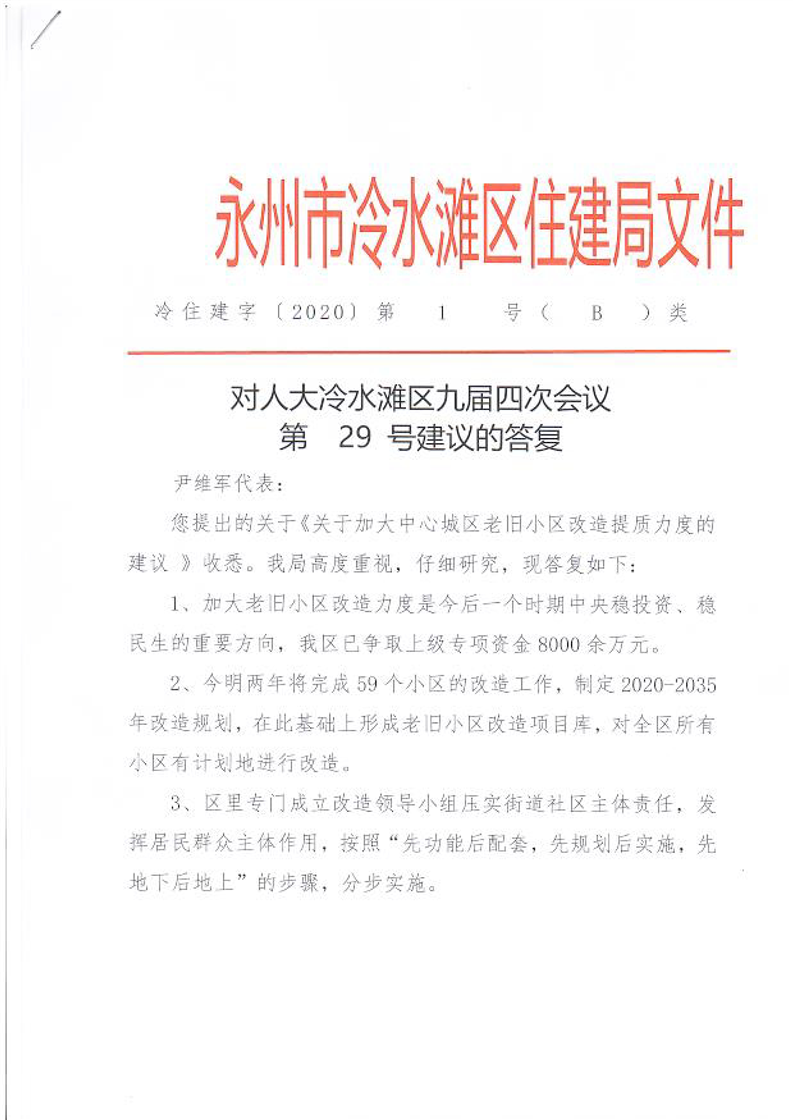 对人大冷水滩区九届四次会议第29号建议的答复