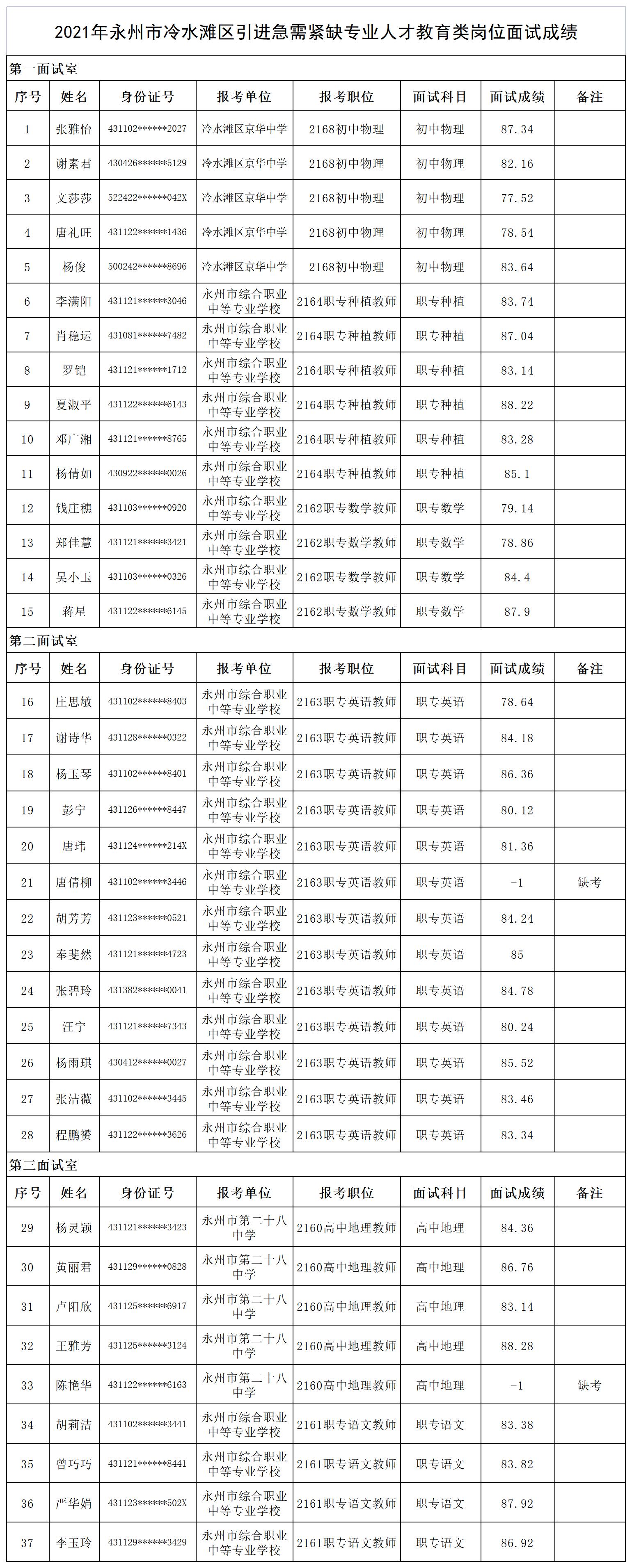 2021年永州市冷水滩区引进急需紧缺专业人才教育类岗位面试成绩通知