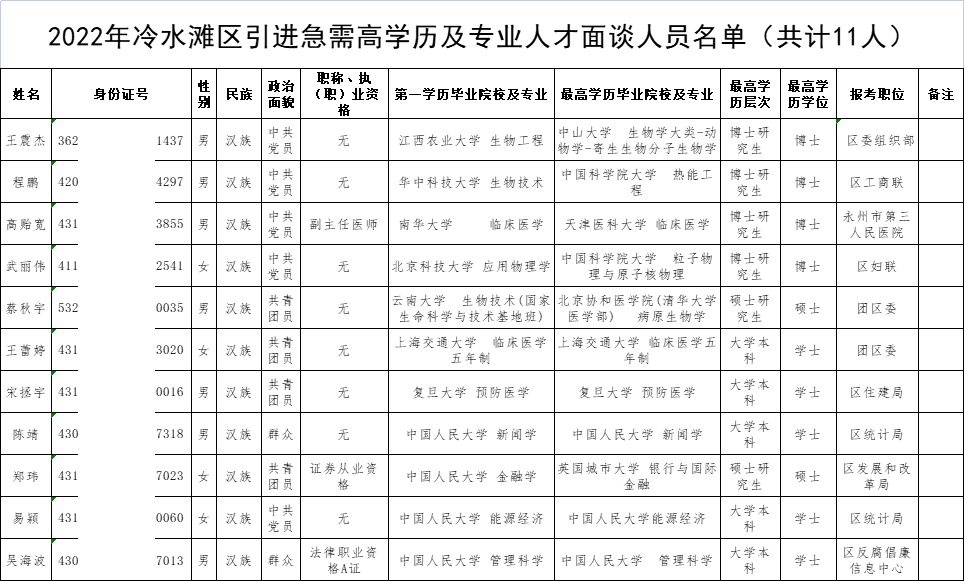 附件:2022年冷水滩区引进急需高学历及专业人才面谈人员名单(共计11人)