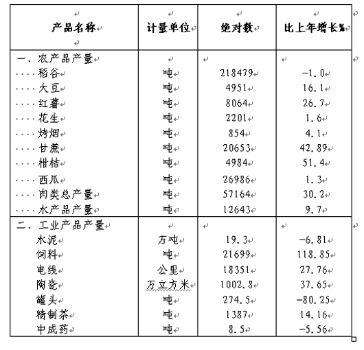 农业结构调整有新突破。全年粮食播种面积43237公顷,比上年减少707公顷,其中早稻减少153公顷;优质稻面积6111公顷,增加2112公顷。经济作物中,大豆、棉花、烤烟种植面积分别达3030公顷、715公顷和526公顷,分别比上年增长3.2%、减少11%和减少2.5%;蔬菜面积为6089公顷,增长2.5%。生猪生产稳步发展,草食牲畜、家禽和名特优水产快速发展,畜牧水产业总产值达到43113万元,比上年增长9.3%,占农业总产值的比重达46%。