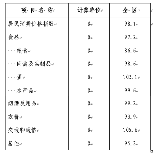 市场价格保持稳定。全年居民消费价格总水平比上年下降1.9%,其中消费品价格下降3%,服务项目价格上涨3.7%,涨幅比上年回落8.9个百分点。在居民消费价格中,食品价格下降2.8%,衣着价格下降6.1%,医疗保健及个人用品价格上涨2.8%,娱乐教育文化用品及服务价格下降0.6%,房地产价格上涨4%。