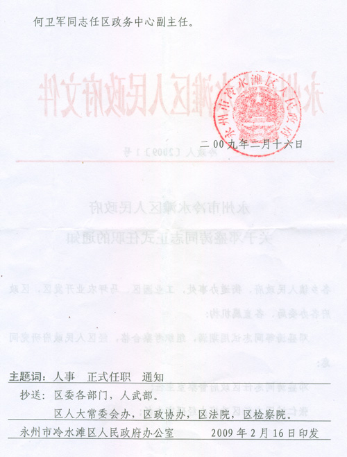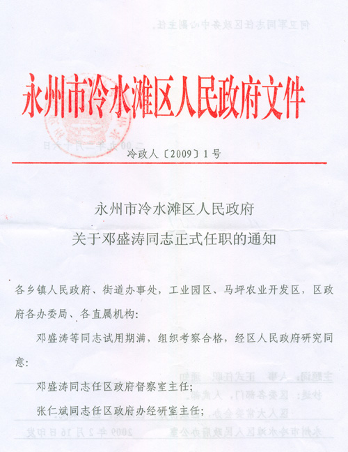 永州市冷水滩区人民政府关于邓盛涛同志正式任职的通知