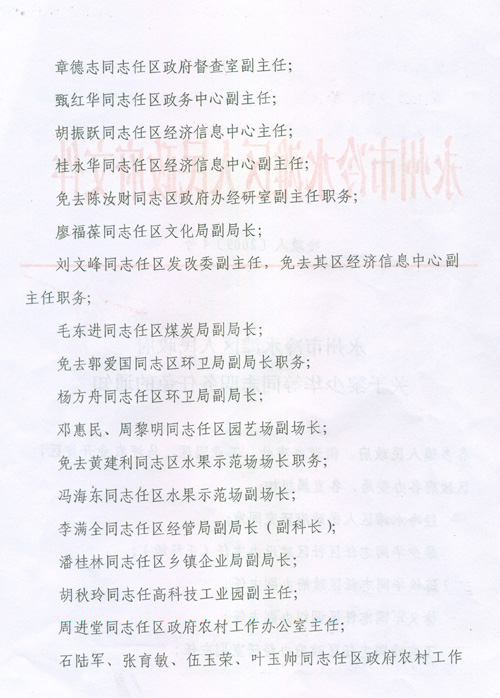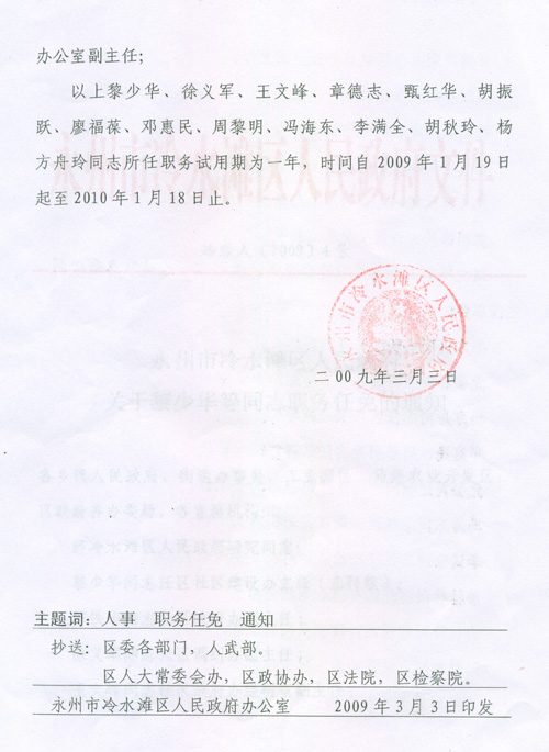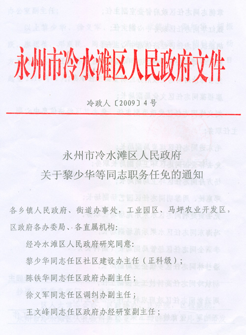 永州市冷水滩区人民政府关于黎少华同志正式任职的通知