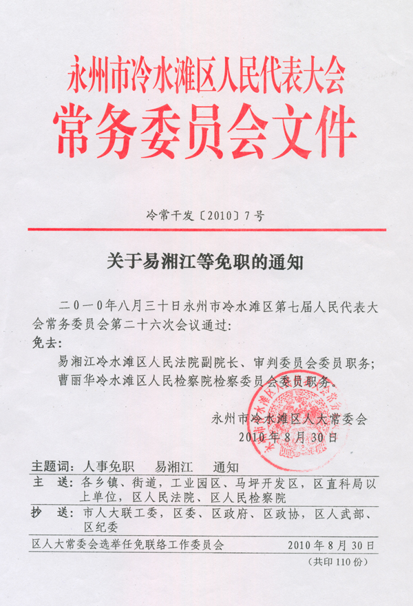 关于易湘江等免职的通知