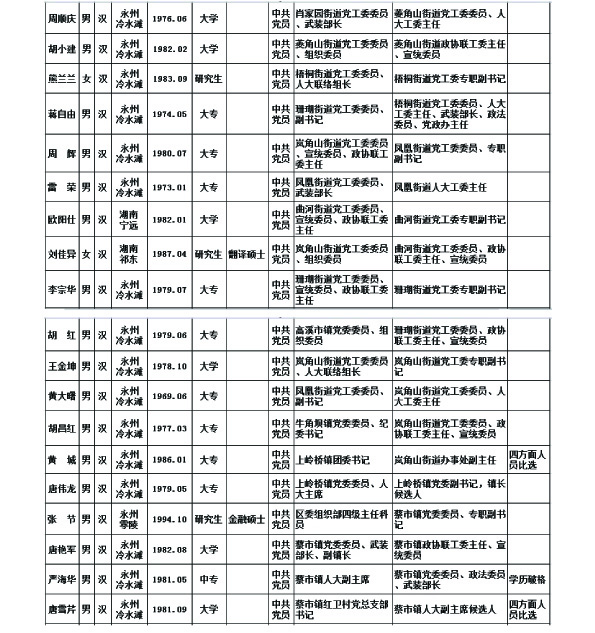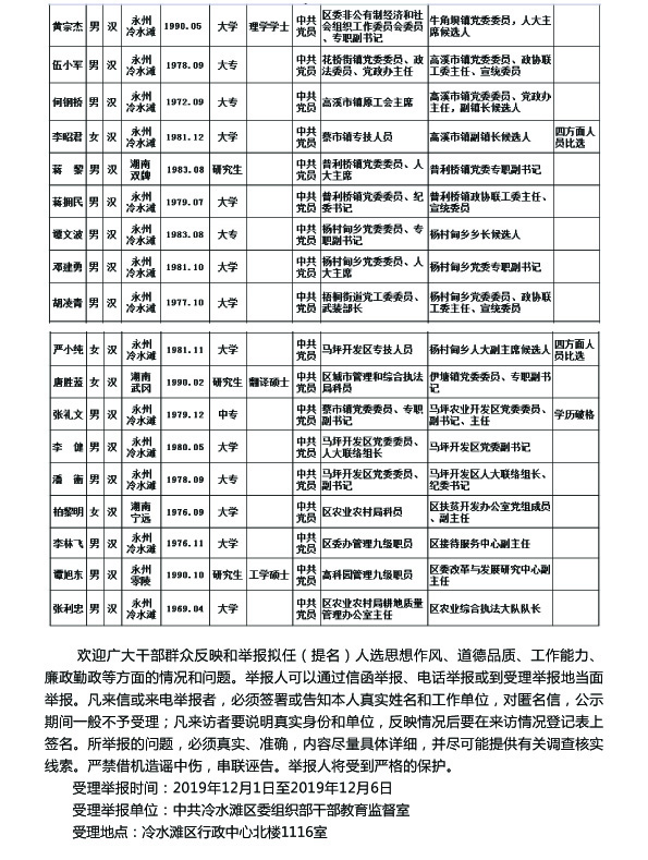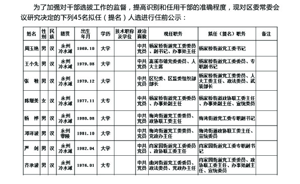 冷水滩区区委管理干部任前公示公告