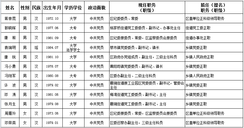 为加强对干部选拔工作的监督,提高识别和任用干部的准确程度,现对区委常委会议研究决定的下列12名拟任(提名)人选进行任前公示: