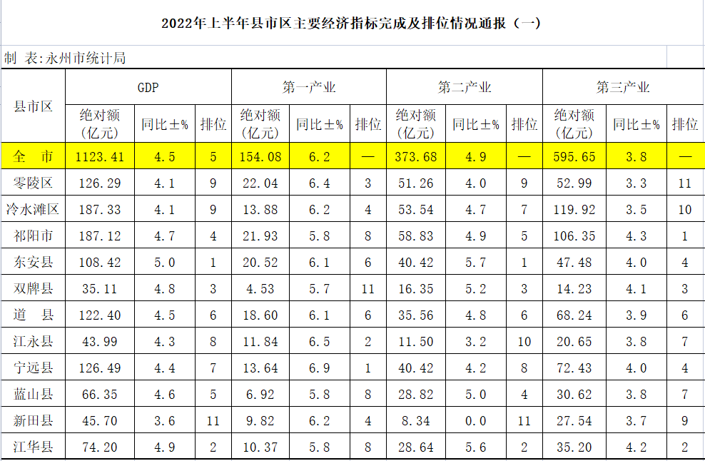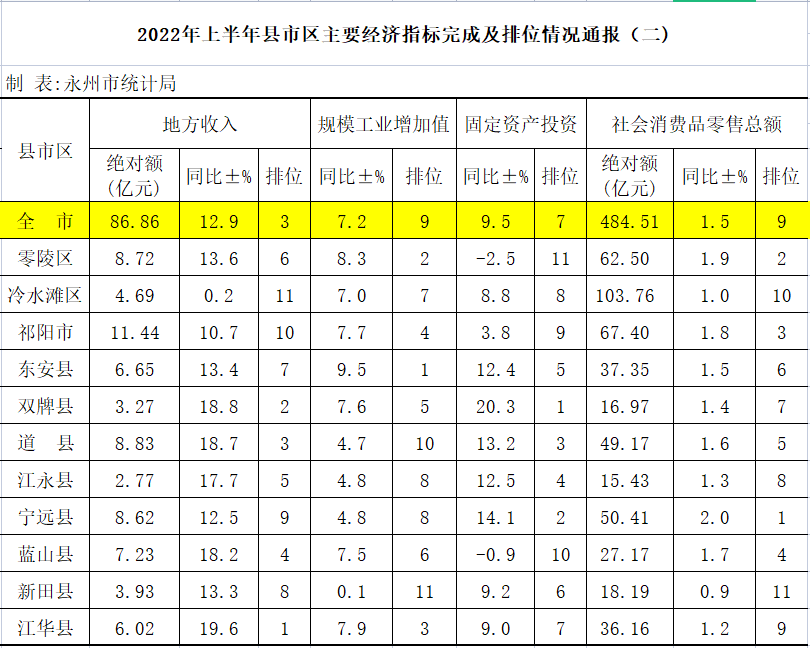 2022年上半年县市区主要经济指标完成及排位情况通报